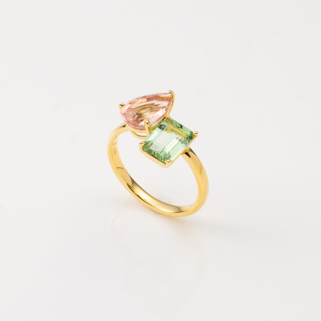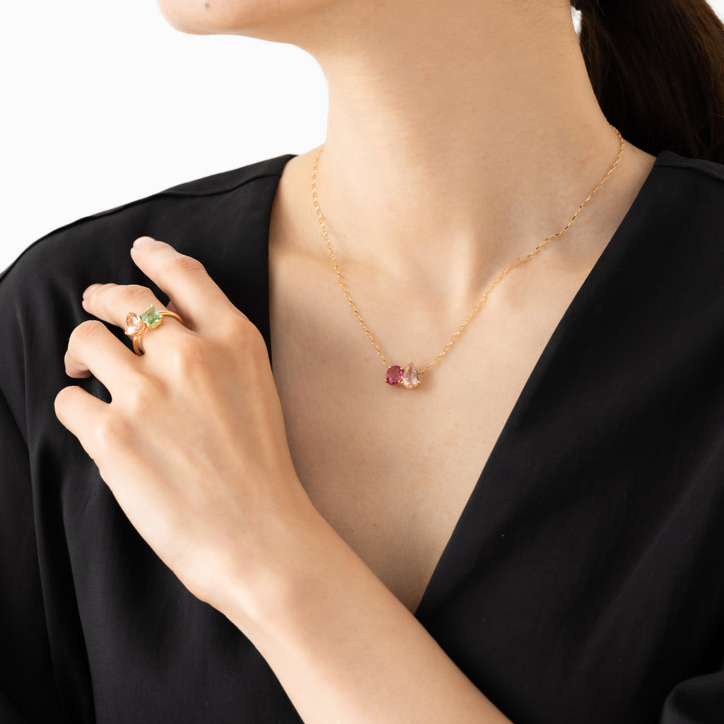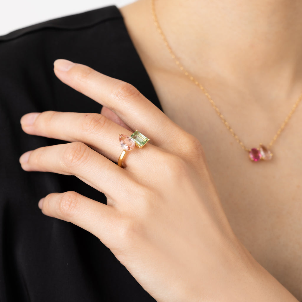 2 Tourmaline stones create poetic harmony, an unique combination with pear-shaped warm Pink Tourmaline and an emerald-cut fresh Green Tourmaline.
