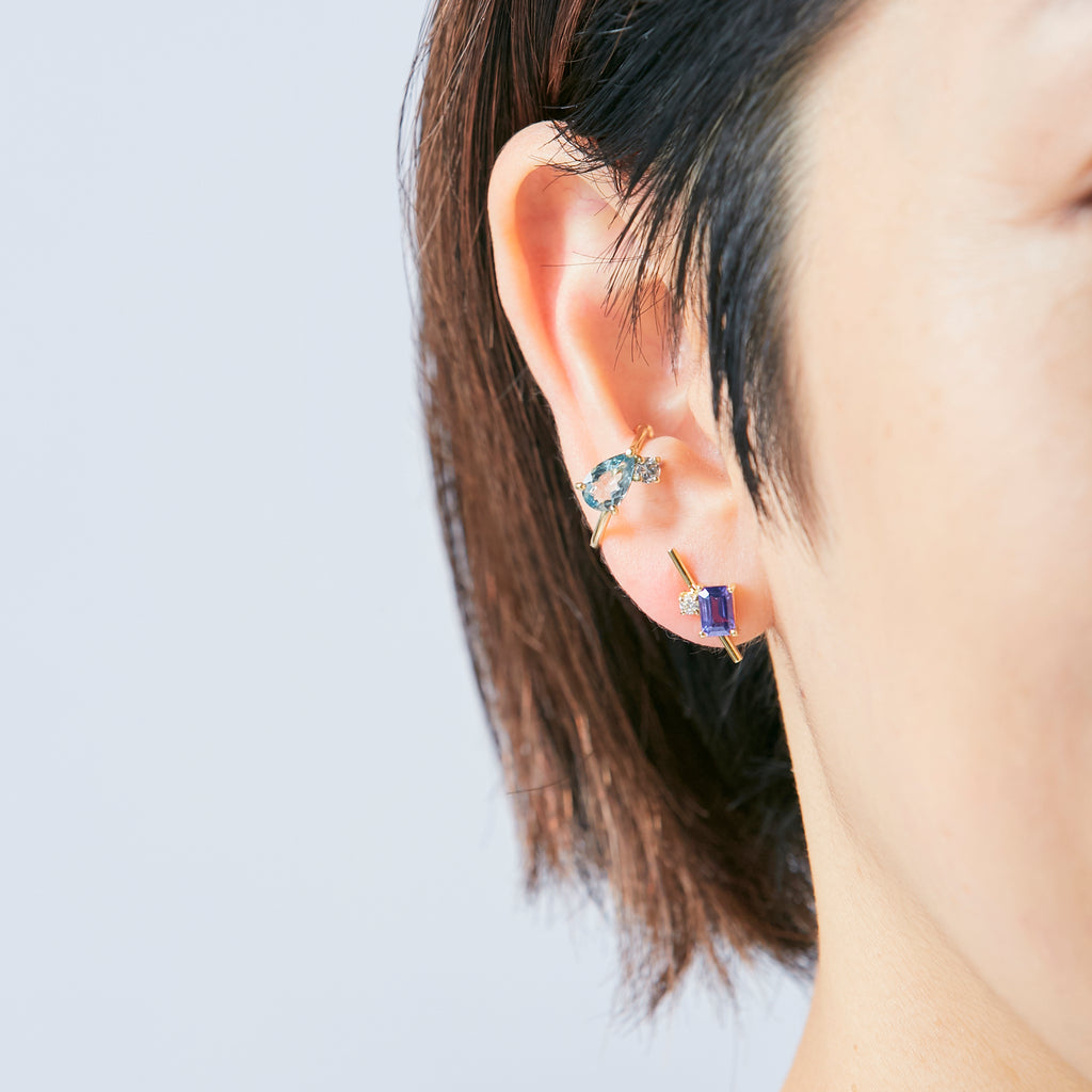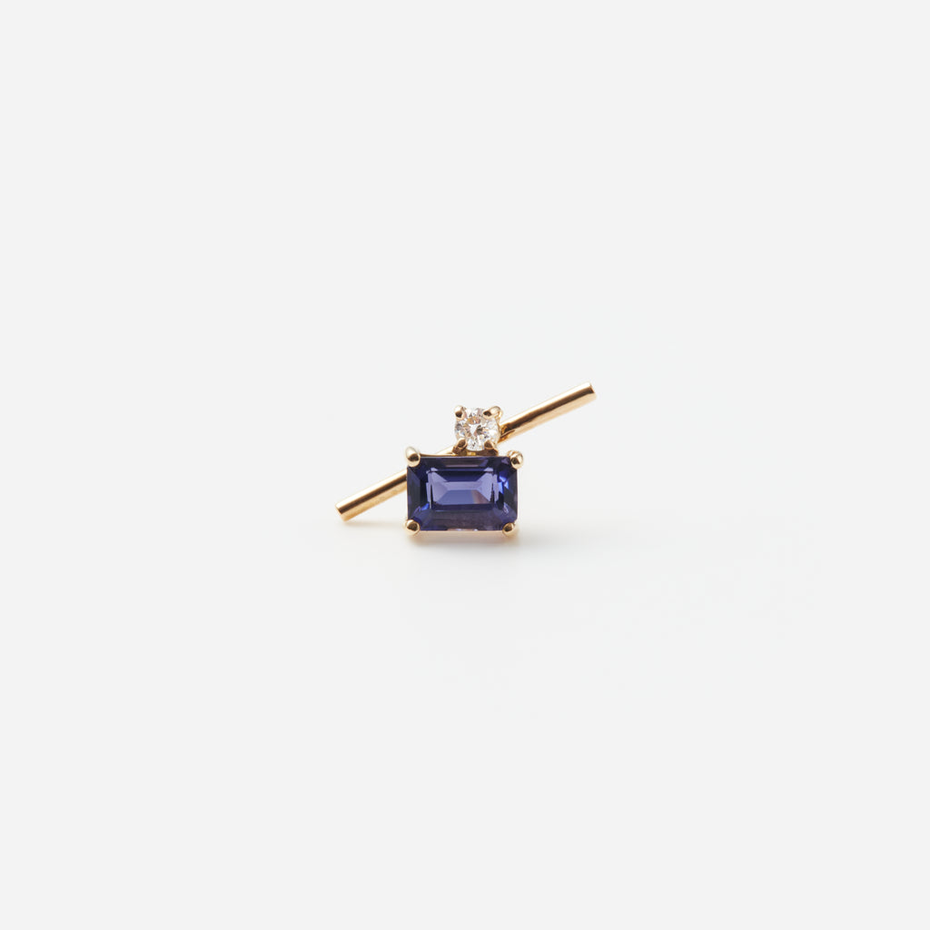 すみれ色の輝きを携えたアイオライトが主役のシングルピアスです。シンプルなのに凛とした個性も備えたバーの上に乗せた、クリスプな輝きを添えるダイヤモンドと、吸い込まれるようなニュアンスの紫のアイオライトとのコンビネーションは、上品でシックな耳もとを演出するでしょう。