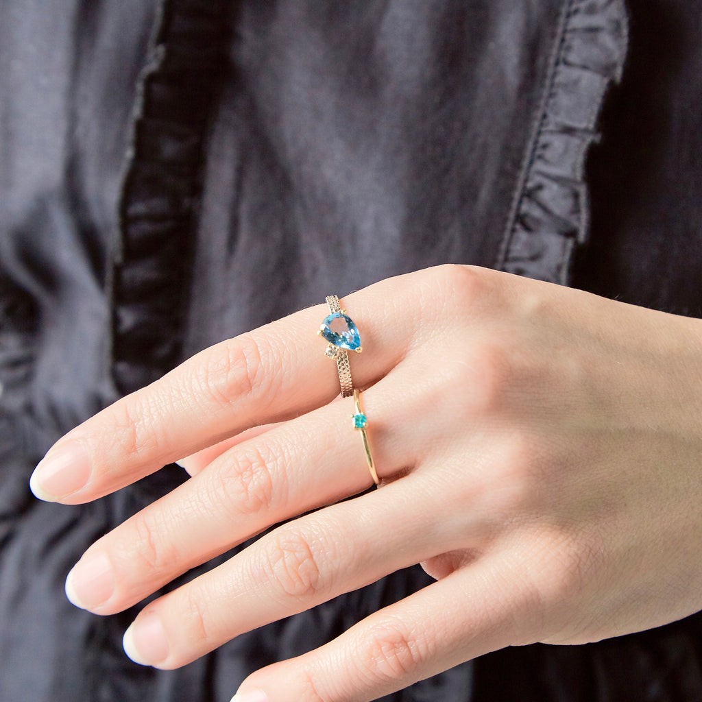 この一点をシンプルに着用してもハッと目を引く美しさを醸しだしますが、重ね付けにしてもさらなる魅力をお楽しみいただけます。爽やかで、溌剌とした手元にと、魔法にかけてくれるリングです。