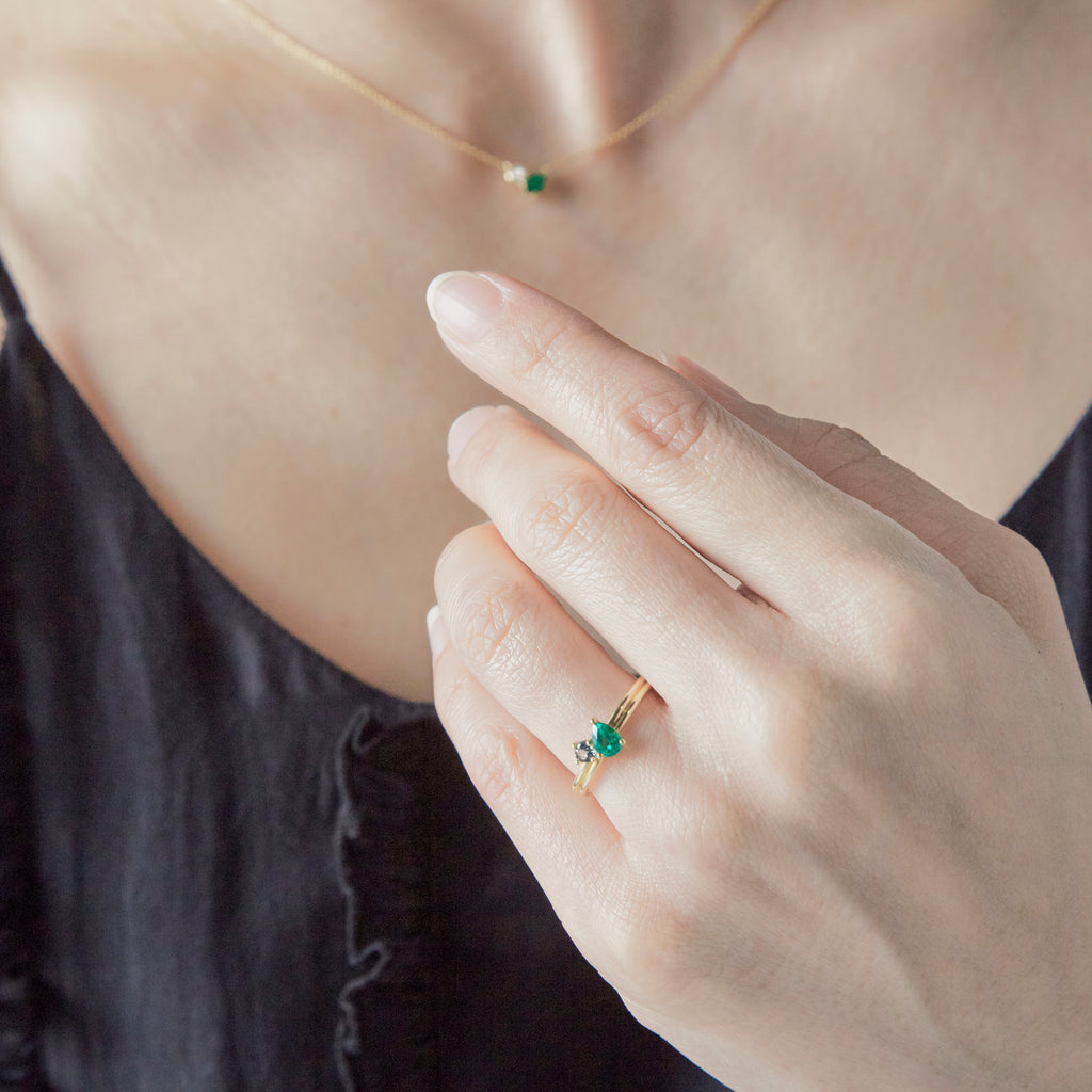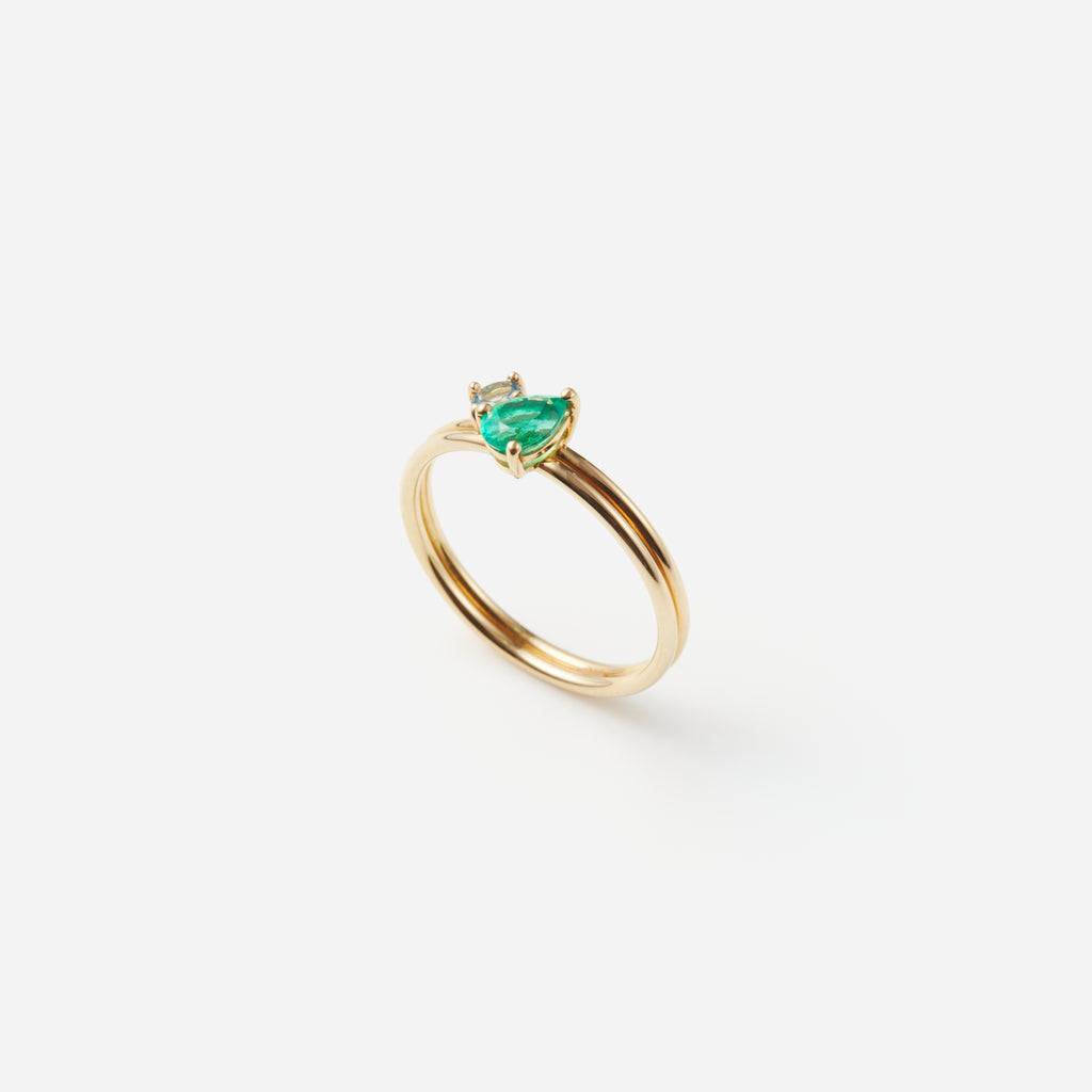 みなぎるパワーと存在感が溢れ出る美しいペアシェイプのエメラルドに、深みのあるサンタマリアアクアマリンを並べました。